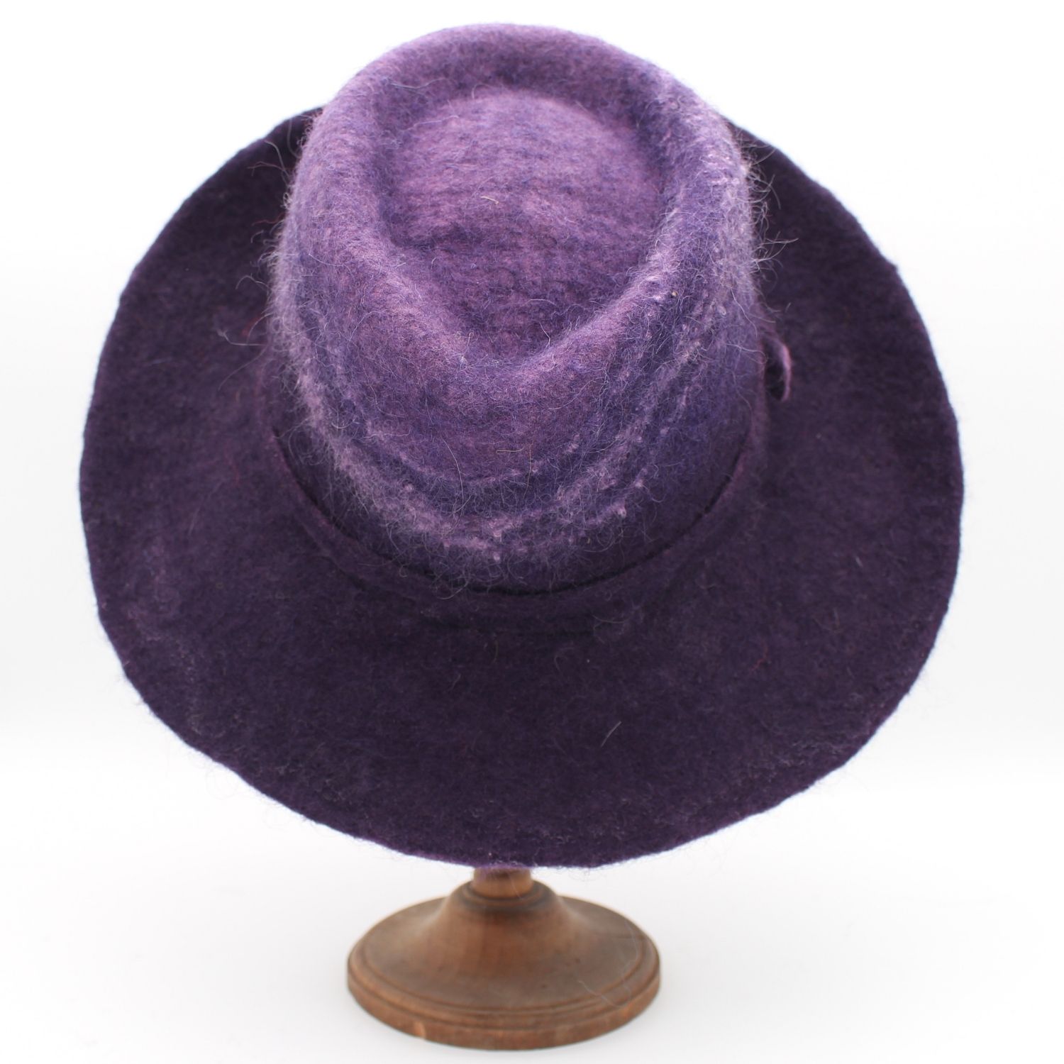 Bonjour ! Je suis le Chapeau Violet Dégradé, unique par ma teinte envoûtante qui joue sur des nuances élégantes. En feutre de laine fait main, je brave la pluie, le soleil et le vent pour protéger et sublimer celui qui me porte.