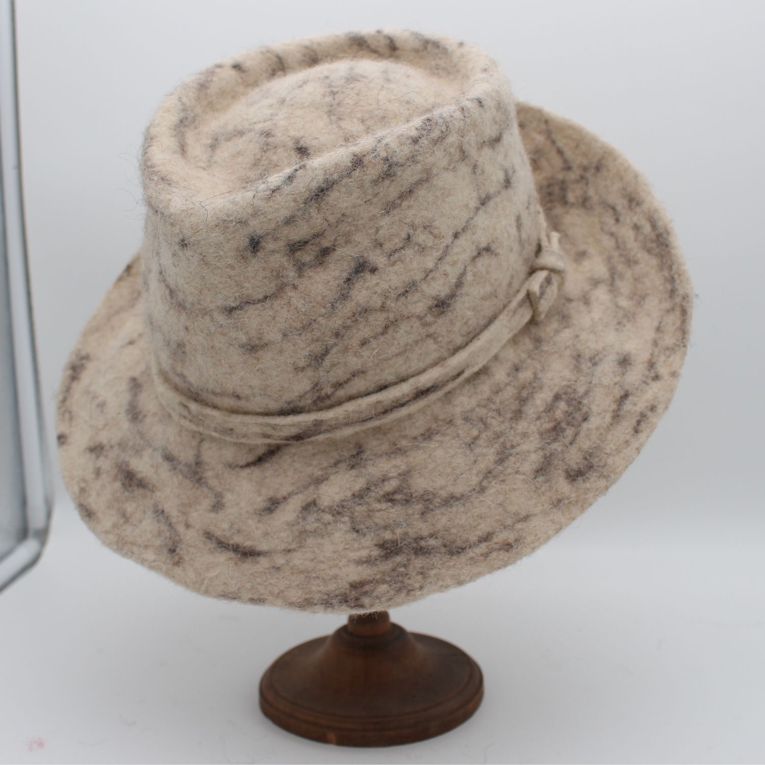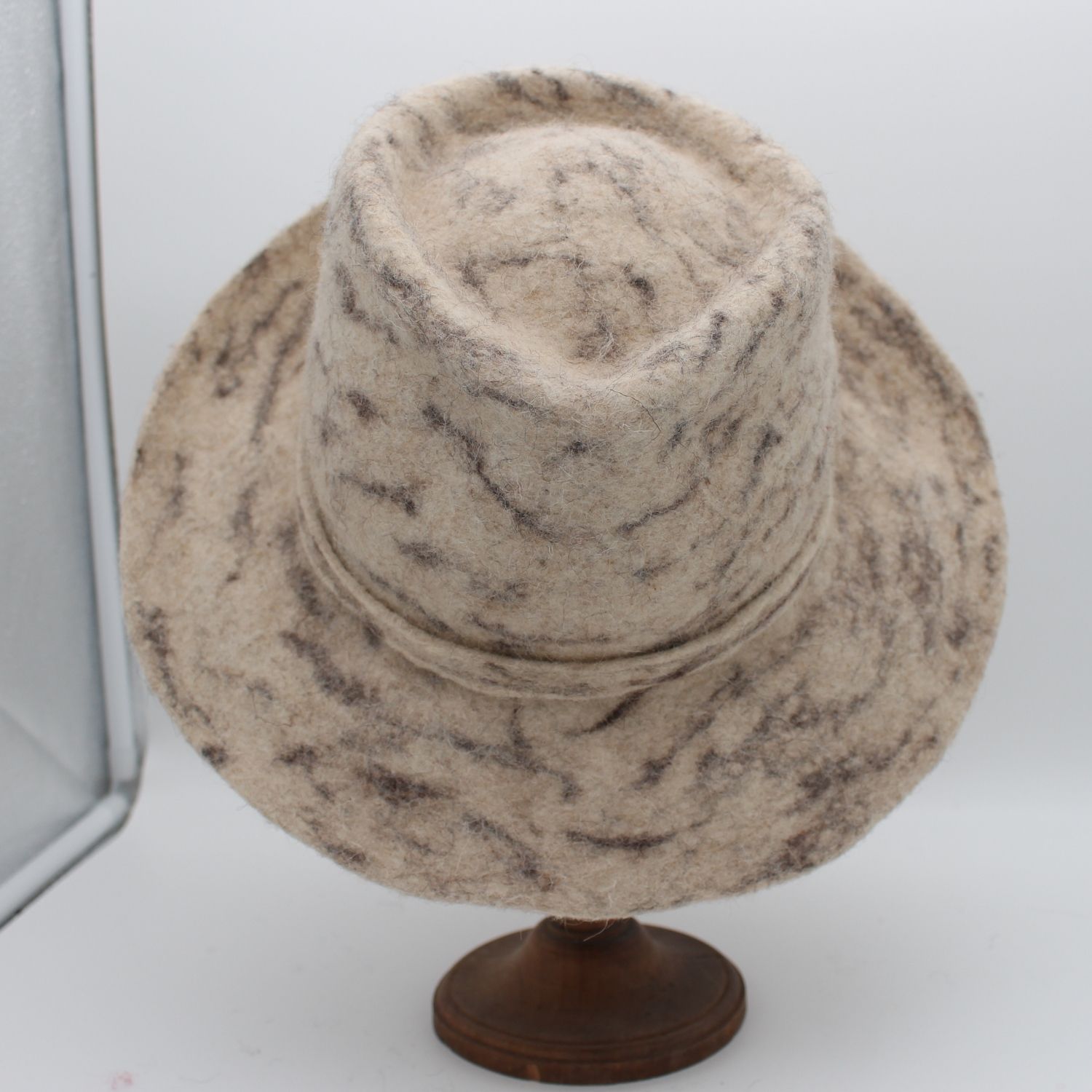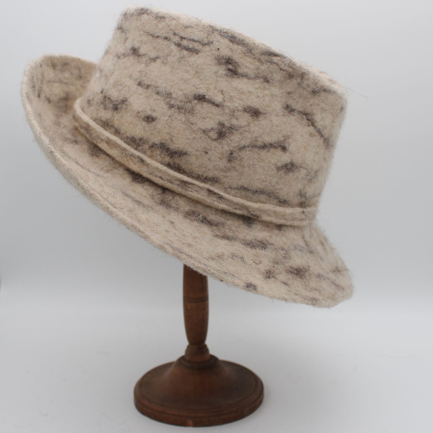 Je suis un chapeau en feutre de laine du petit mouton ouessant…mes motifs évoquant les veines élégantes du marbre, et doté de larges bords majestueux. Mon allure sculpturale et artistique attire les regards tout en offrant une protection optimale contre les éléments. Avec mon design audacieux et raffiné, je suis le parfait équilibre entre sophistication et originalité. Polyvalent et moderne, je sublime votre style en ajoutant une touche d’élégance intemporelle. Je suis bien plus qu’un simple chapeau : une véritable œuvre d’art à porter.